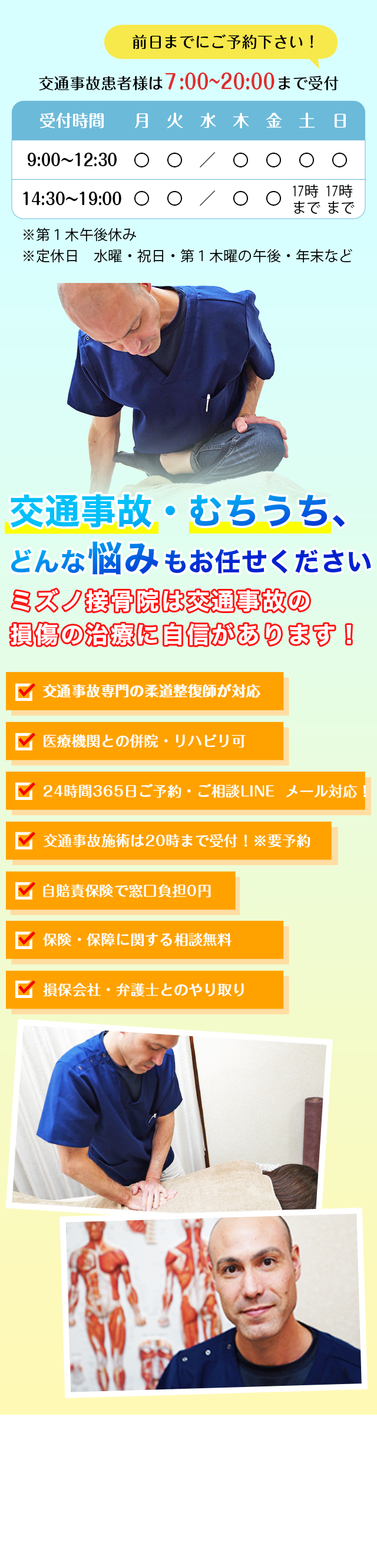 また、水野先生は整形外科での勤務経験とこれまでさまざまな勉強会に積極的に参加された経験から、交通事故にあわれた方のケガや慢性痛など、多岐にわたる施術もされています。